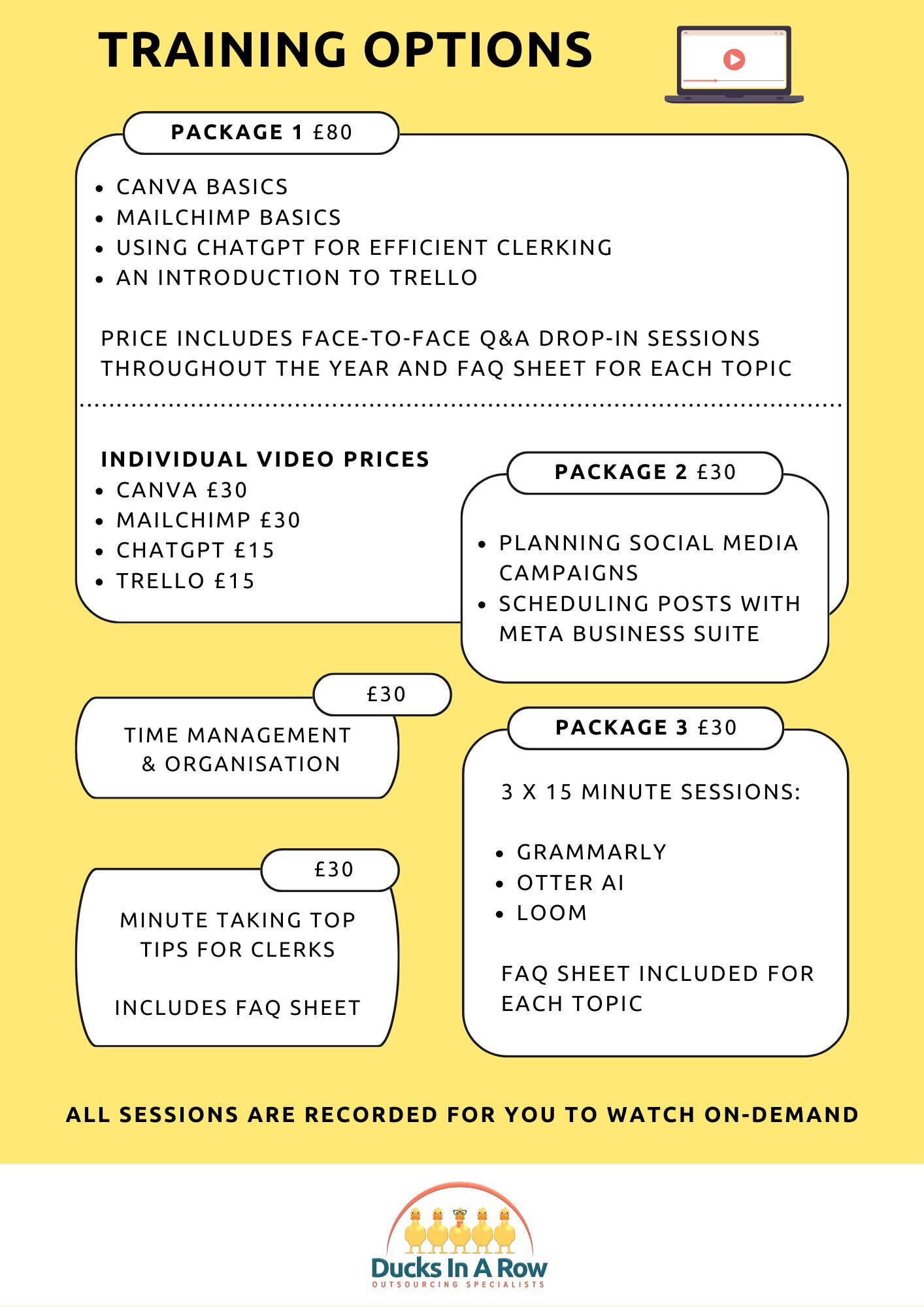 Please see the following links for training packages for clerks delivered by Ducks in a Row: Clerk training packages (1)Download Clerk info sheetDownload ...